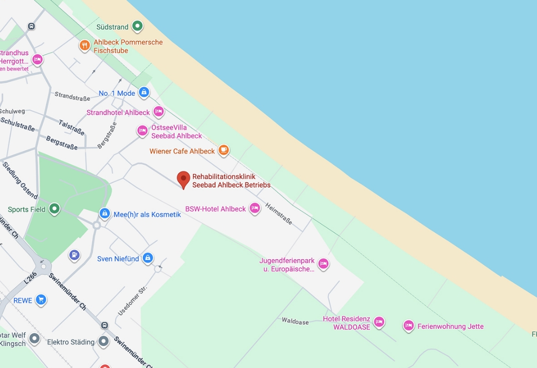 Die Rehabilitationsklinik Seebad Ahlbeck liegt direkt an der Strandpromenade in der Dünenlandschaft des Seebades. Das Seebad Ahlbeck ist seit über 100 Jahren das bekannteste und beliebteste Seebad auf der Insel Usedom. Eine über zehn Kilometer lange Strandpromenade mit großen schattenspendenden Bäumen verbindet Ahlbeck mit den anderen Kaiserbädern Heringsdorf und Bansin.